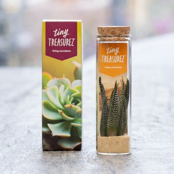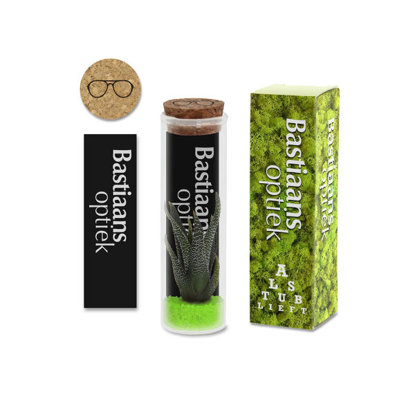 De Tiny Treasurez® Message in a bottle small is een originele groene give-away, perfect als relatiegeschenk tijdens evenementen, beurzen, themadagen of bedankmomenten. In het glazen flesje bevindt zich een laagje zand of gekleurd grind, een sfeerkaartje met informatie over de Tiny Treasurez en natuurlijk de levende mini-succulent. Het standaard kaartje kan desgewenst worden vervangen of gepersonaliseerd met een eigen boodschap. Ook de kurk op de fles kan bedrukt worden.